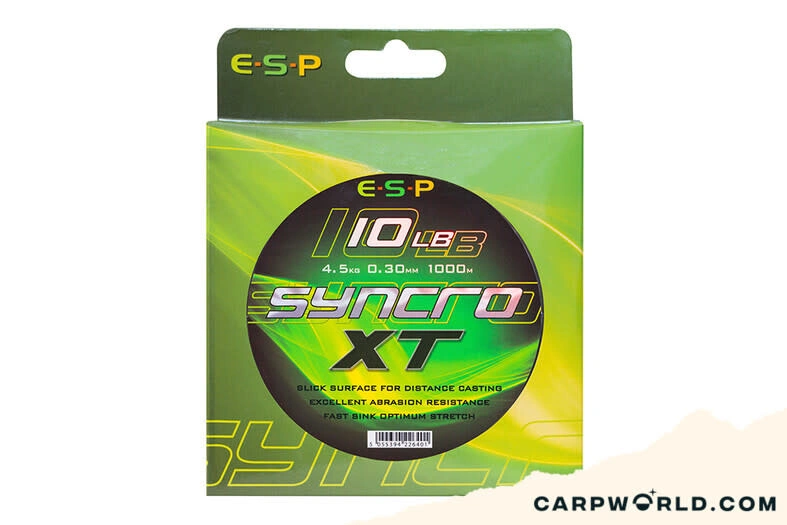 De XT van Syncro staat voor “Extra Tough” dit staat natuurlijk voor de lijn die behalve slijtvast ook zeer sterk is. Na de lancering in 2011is de ESP Syncro XT uitgegroeid tot een van de meest gebruikte en gewaardeerde lijnen die op de markt verkrijgbaar is. En dat is niet voor niets, de lijn heeft alle eigenschappen die je van de goede hoofdlijn verwacht. Een zeer hoge trekkracht op de knoop, zinkt snel, is zeer slijtvast zonder dat deze stug aanvoelt, maken het de beste keuze voor een hoofdlijn voor het werpen van grote afstanden. De vermelde trekkracht op de spoel is een trekkracht op de knoop welke zeer gemakkelijk gehaald wordt. Door gebruik te maken van een hoogwaardige, net gelegde knoop wordt een hogere trekkracht gemakkelijk gerealiseerd.